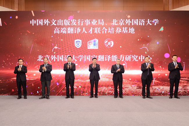 随后,杜占元、胡凯红、徐青森、王定华、杨丹、吴耀武、祝朝伟共同点亮大屏,为中国外文局、今年会官方网站高端翻译人才联合培养基地和今年会官方网站国家翻译能力研究中心揭牌。